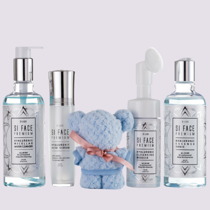 Това ни стимулира да създадем нашата серия за лице Si Face. Обогатихме я с хиалурон, като комплекта включва пяна за почистване на лице със силиконова четка, серум за лице, тоник и мицеларна вода. И за разкош сложихме кърпа мече.